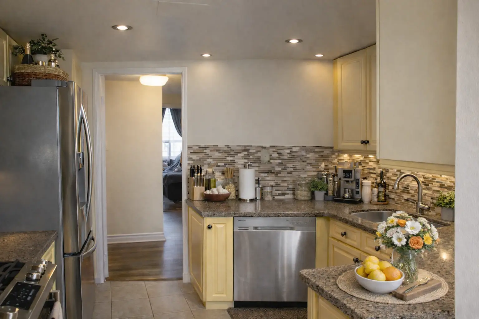 Equipped with stainless steel appliances, beautiful countertops, and a striking backsplash.